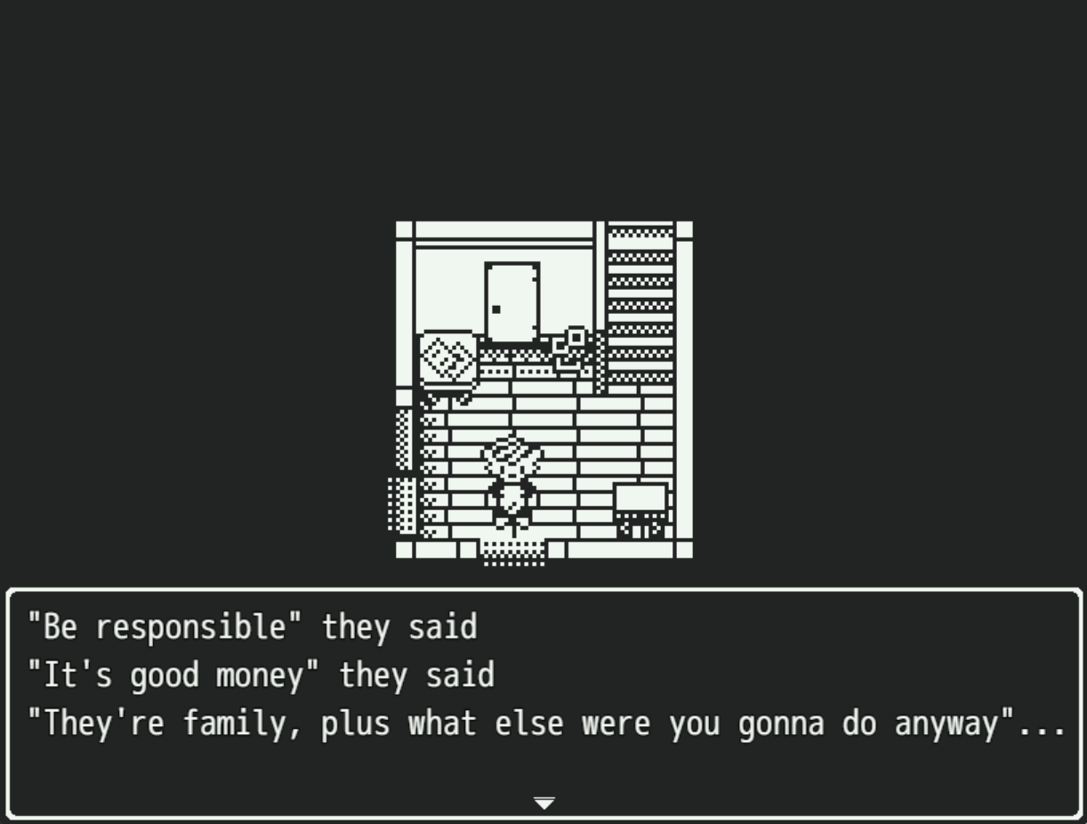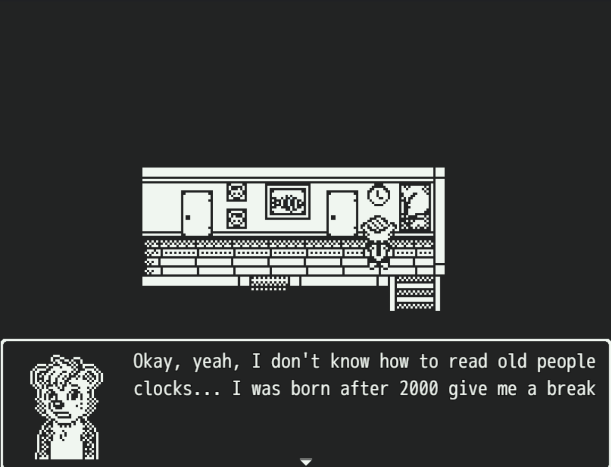 A linear, top-down, 1 bit, furry, fetish, regression game featuring a boy bear college student stuck house sitting over spring break. The more you explore and interact the further you regress.